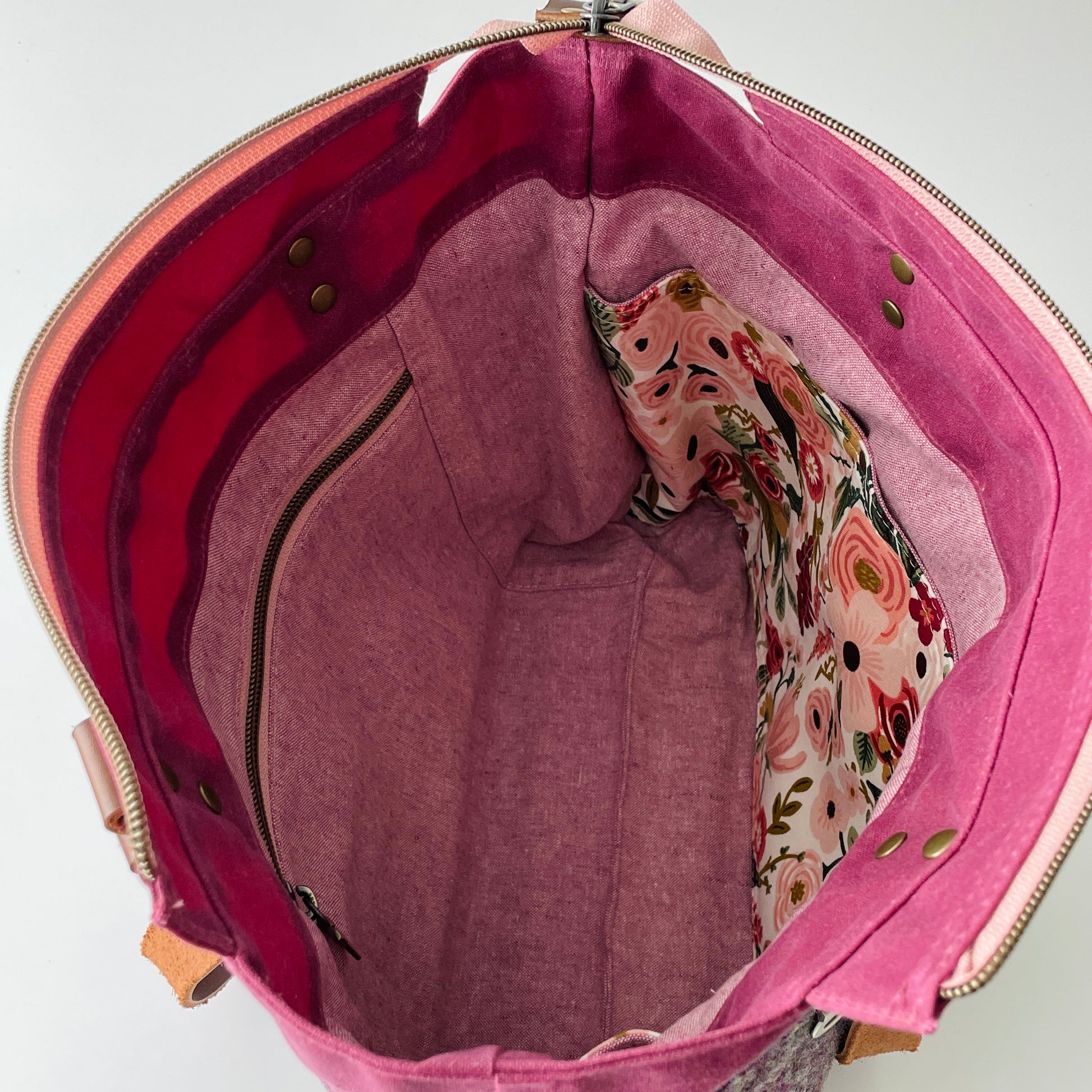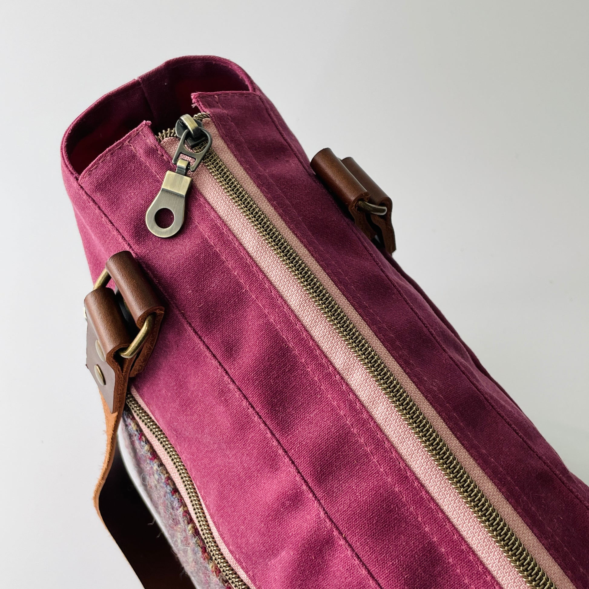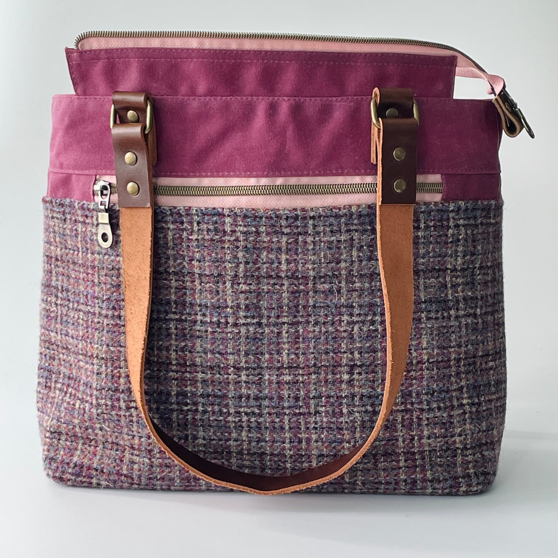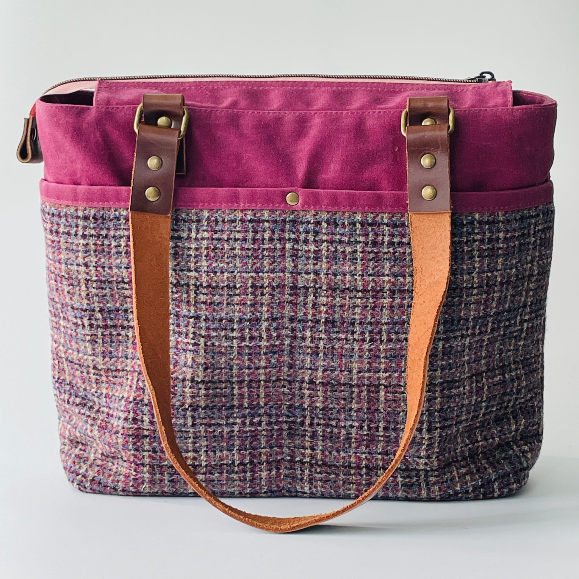 A large shoulder tote featuring waxed canvas and Harris Tweed. The bag has seven pockets and measures 11" tall, 12" wide, and 4.5" deep. Featuring leather straps and a zipper closure.