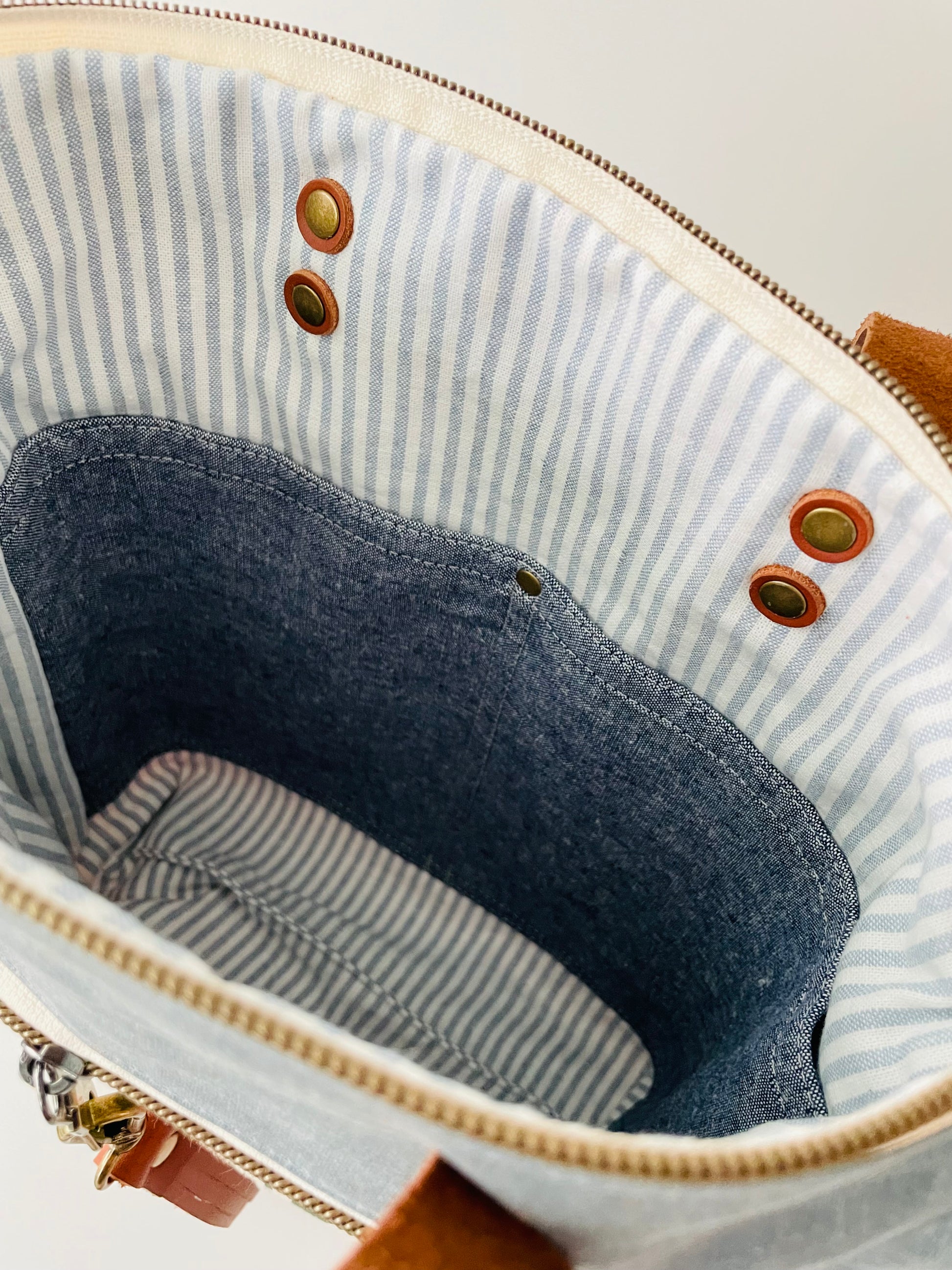 This sewing pattern is protected by copyright and may not be reproduced, printed or sold without the author’s permission.  The purchaser may sell bags made from this pattern, but only on a small handmade scale.  Please credit the Aberdeen Tote by Hammerstitch Bags in your product listings and social media posts.