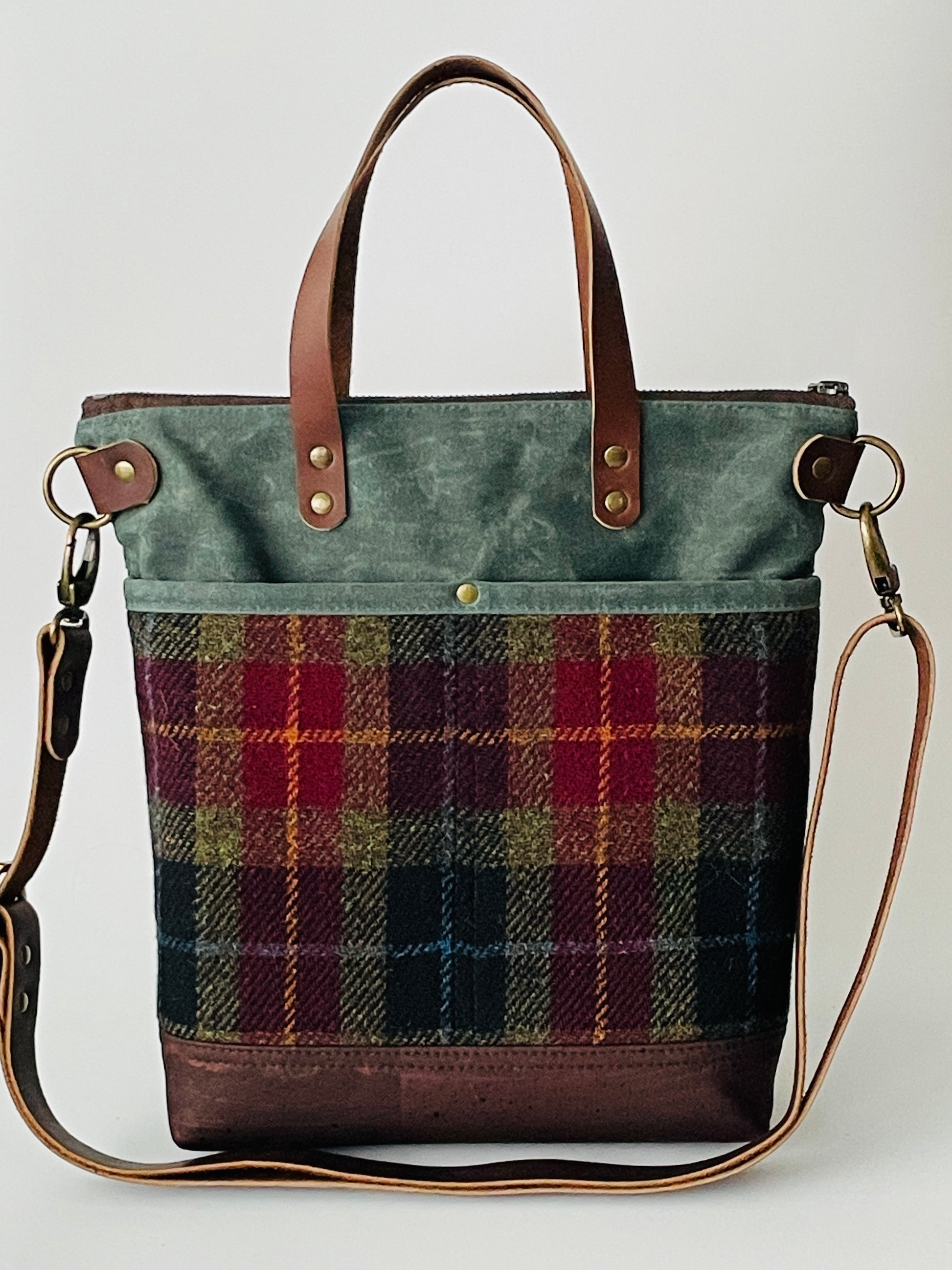 A large crossbody bag made with authentic Harris Tweed and waxed canvas. This bag features 5 pockets to keep you organized, as well as a genuine leather strap, handles, and keychain tassel.
