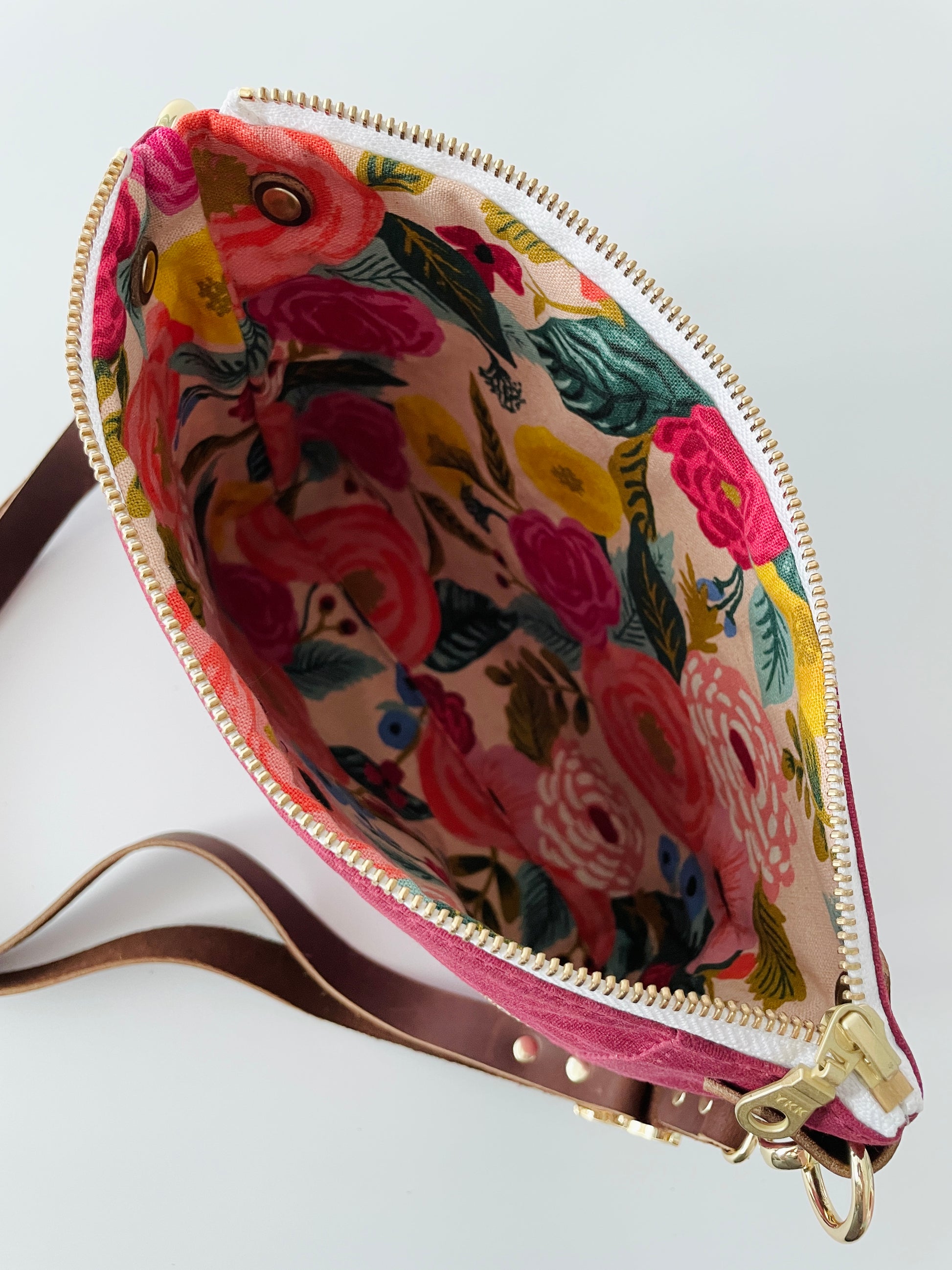 A small crossbody bag with five pockets and an adjustable leather strap. The perfect size for all of your small essentials. Made with water-resistant waxed canvas and a beautiful floral lining.