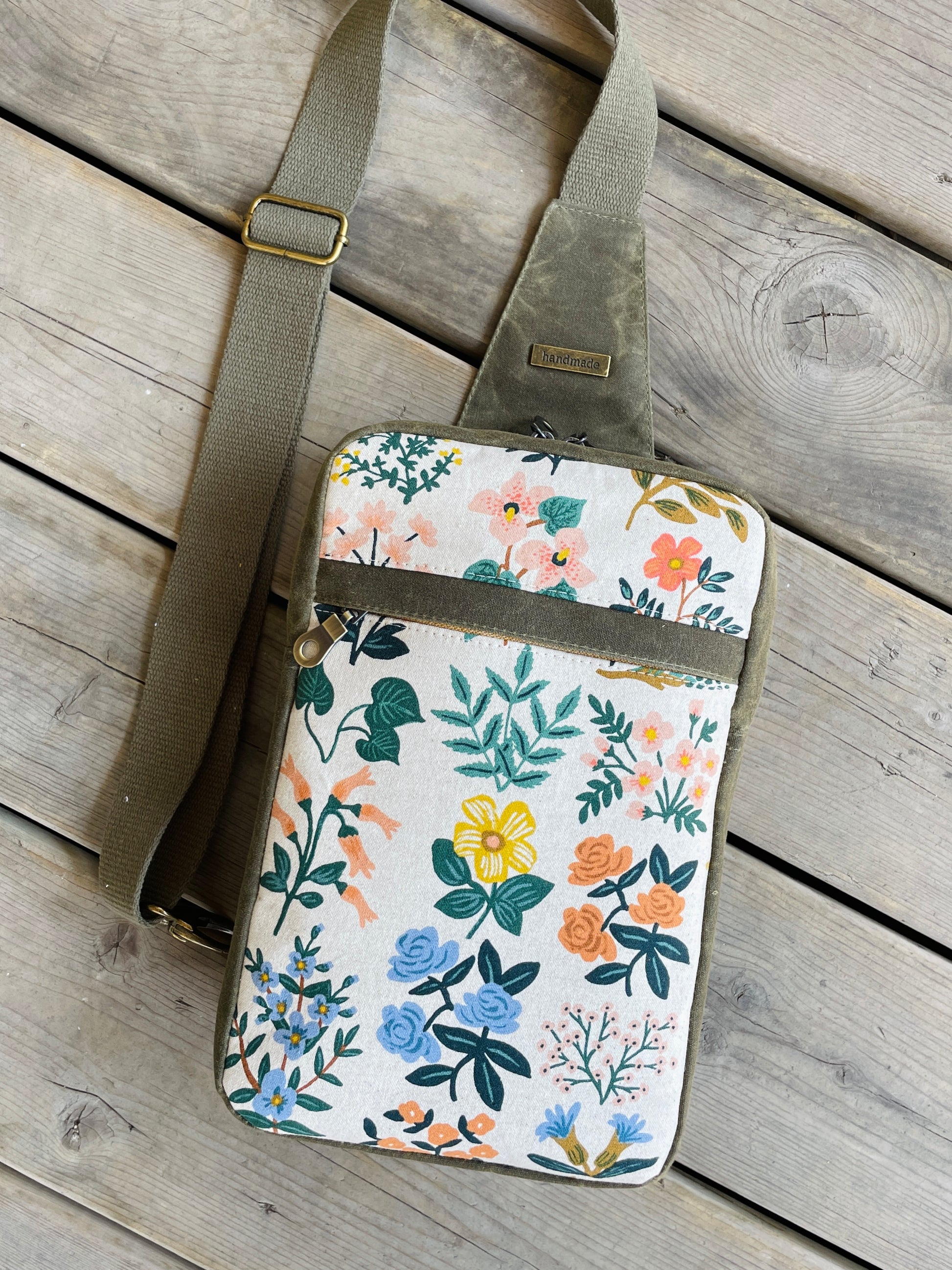 This waxed canvas sling backpack is the perfect companion for your next casual outing. Featuring a beautiful floral by Rifle Paper co. on the front pocket, this bag can be worn comfortably over the right or left shoulder.